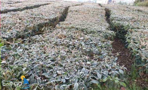 Đối lập với mảng màu sắc bung nở của muôn vàn loài hoa thì bạn có thể ngắm nhìn màu úa của cỏ cây, đồi chè bị sương muối bao phủ.