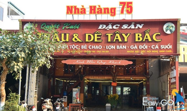 Nhà hàng 75 Trâu Tây Bắc nổi tiếng với những du khách du lịch Mộc Châu. Với không gian bình dị, mộc mạc và rộng rãi nhưng vẫn giữ được sự sang trọng, lịch sự cùng thiết kế nhà sàn xinh xắn ngay cạnh quốc lộ 6 đem lại cho bạn cảm giác đặc biệt.