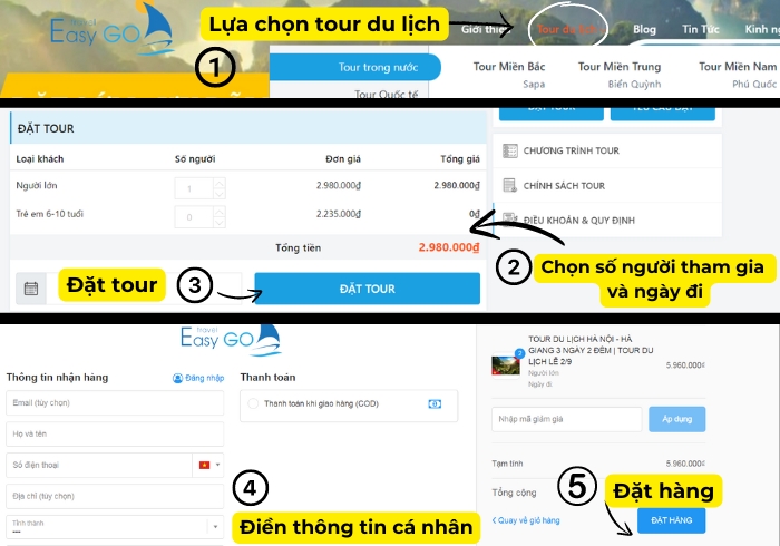1. Đặt tour trên website: Trước tiên bạn cần truy cập website https://www.easygo.com.vn lựa chọn tour muốn đi. Sau đó bạn chọn số lượng người lớn và trẻ em tham gia tour, ngày khởi hành và cuối cùng là điền thông tin cá nhân để tiến hành thanh toán.